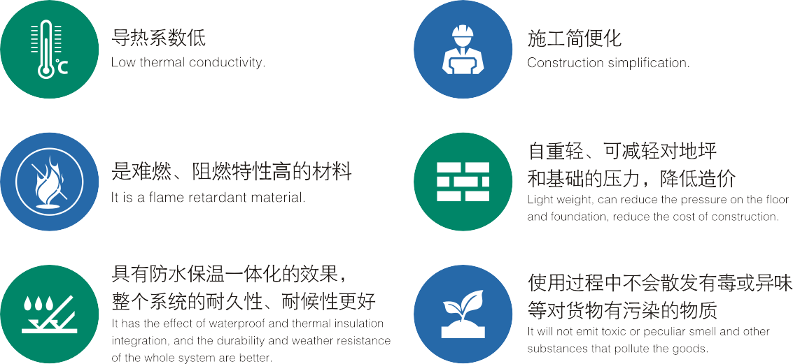 導熱係數(shù)低;施工簡(jiǎn)便化;難燃(rán)、阻燃特性高;自重輕、可減輕對地坪和基礎的壓力,降低造價;具有防水保溫一體化的效果,整個係統的耐久性、耐候性更好;使用過程不會散發有毒或異(yì)味等對貨物有汙染的(de)物質(zhì)。